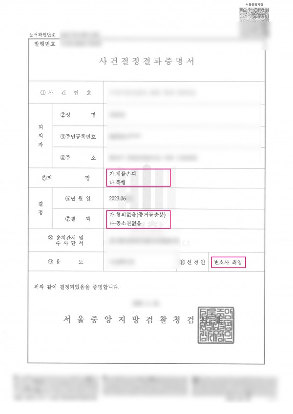 이에 수사기관에서는 당시 전후의 사정을 판단하여 변호인의 주장을 모두 받아들였고 의뢰인에게 재물손괴에 대하여 혐의없음 으로 불송치 하였으며 폭행죄에 대하여는 고소인이 의뢰인에 대하여 처벌을 원하지 않는 의사를 명시하였으므로 공소권없음 처분을 하였습니다.
