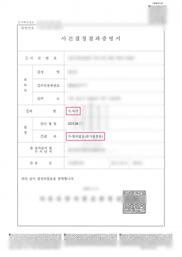이러한 주장에 검찰 또한 사실관계는 인정되나 성명불상자와의 대화내역을 살펴보면 명품 구매대행 아르바이트로 1회 10만원을 지급하고 명품 구매를 희망하는 고객으로부터 돈을 받아 명품을 구매하기 위해 줄을 서는 사람에게 전달하는 일을 하면 된다고 설명하는 내용들이 확인되는데 일당 수준 및 업무 태양 등에 비추어 보았을 때 피의자 입장에서 실제 명품 구매대행 아르바이트를 하는 것이라고 오인하였을 가능성을 배제하기 어려우며 피해자의 요구에 따라 자신의 운전면허증을 보여준 바 자신의 행동이 보이스피싱 범행의 과정이라고 생각하였다면 순순히 자신의 실제 신분증을 제시하지 않았을 것으로 보이는 점, 본 건 현금수거행위 이외 다른 수거행위에 가담하지 않은것으로 보이는점 등 기타 변호인의 의견을 반영하여 혐의없음 처분을 하였습니다.