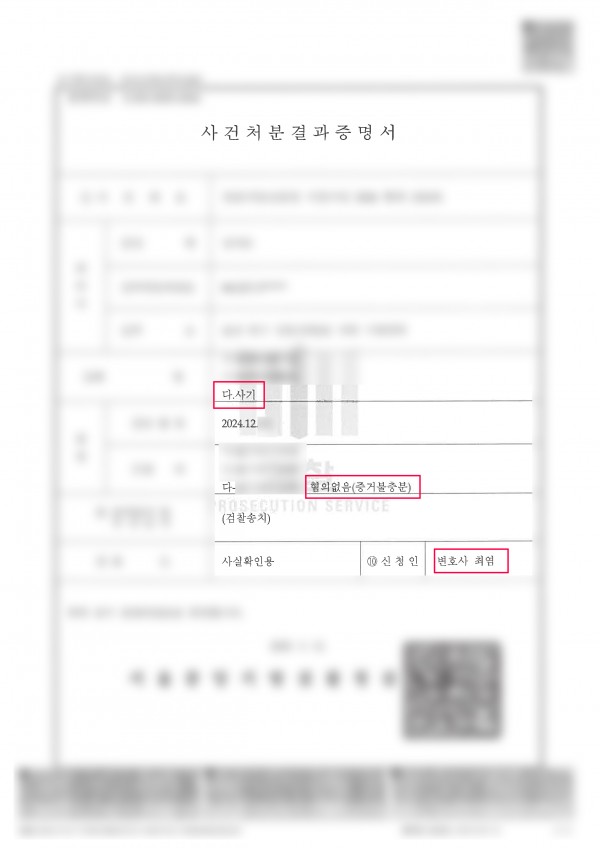 이에 검찰은 당시 범행을 중단할 목적으로 입국한 것으로 보이며 해당 기간에 범행에 가담하였다고 볼 자료가 없는 점 등을 비추어 볼 때 이 사건 범죄단체에서 활동하며 다른 조직원들의 사기 범해에 가담하였다고 단정하기 어렵고 달리 피의사실을 인정할 증거가 없기에 혐의없음 처분을 하였습니다.