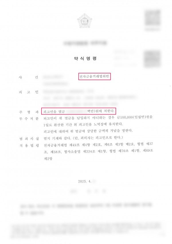 대포통장 벌금형/전자금융거래법위반(동종집유전과1회) 벌금(구약식)