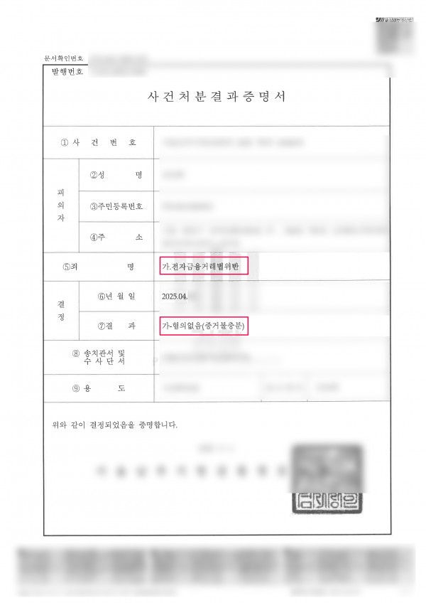 대포통장무혐의/전자금융거래법위반무혐의(불기소)