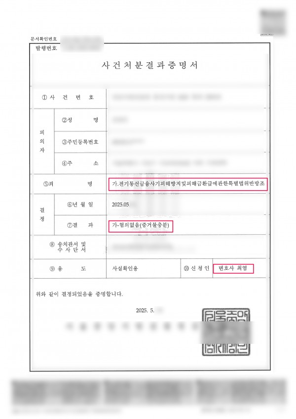 보이스피싱 무혐의/전기통신금융사기피해방지및피해금환급에관한특별법위반방조 무혐의