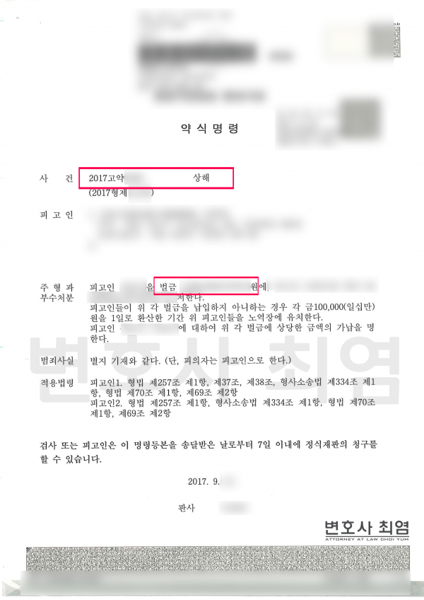 또한 상해 사건이기에 합의가 원만하게 이루어질 수 있도록 하였습니다. 다행히 두 명의 피해자와 원만하게 합의하여 구약식(벌금형)의 처분을 받을 수 있었으며 의뢰인에게 시비를 붙인 피해자 또한 상해로 벌금형의 처분을 받게 되었습니다.