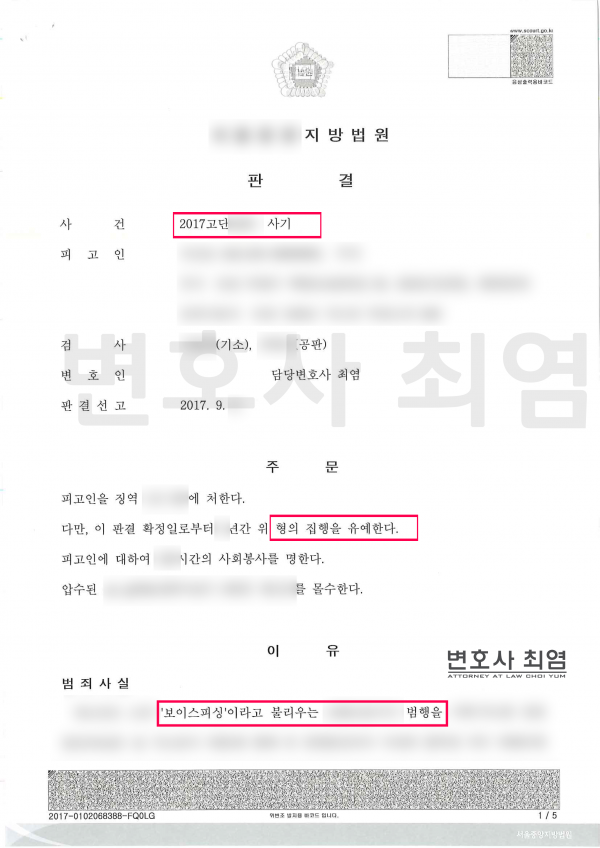 이 사건은 보이스피싱 범죄로서 수사기관의 수사 의지가 강력하여 수사 초기부터 현행범으로 체포 구속되어 방어권 행사가 매우 어려웠던 사건이고, 실제로 검사가 징역 5년을 구형하였습니다.