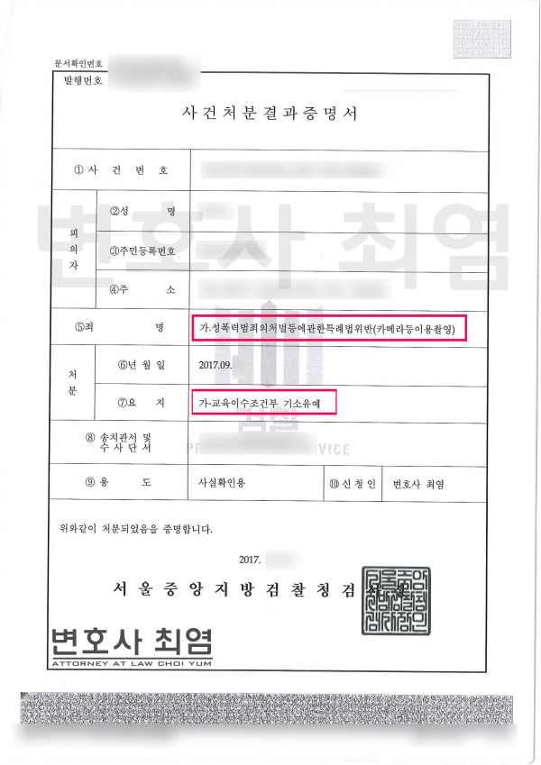 치마 속을 촬영하였으나 다소 우발적이고 1회성 범행이며 신체의 노출이 거의 없는 점, 이 사건으로 인하여 깊은 반성을 하고 있으며 치료 등을 통하여 다시는 범죄를 저지르지 않겠다고 다짐하고 있는 점 등을 강조하여 변호인 의견서를 제출하였고 검찰은 변호인의 변론을 적극 받아들여 성폭력범죄 예방교육 이수를 조건으로 기소유예 처분을 하였습니다.