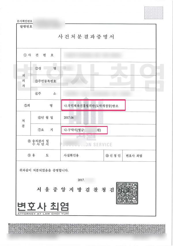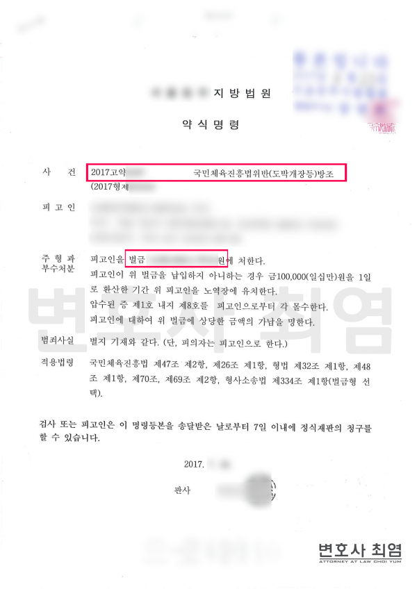 범행 사실을 인정하고 반성하고 있으며, 처음부터 도박 관련 사이트라는 것을 알았다면 취업하지 않았을 것이며 일한 기간이 얼마 되지 않아 구체적인 업무를 볼 시간조차 없었다는 점 등을 강조하여 의견서를 제출하였고 의뢰인은 구약식으로 벌금형의 처분을 받을 수 있었습니다.