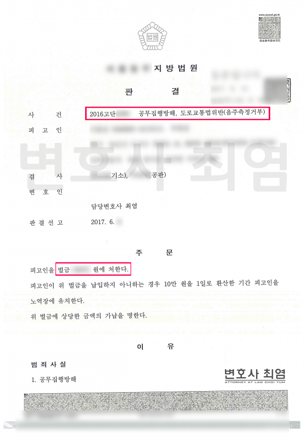 특히 앞으로 다시는 술을 마시지 않겠다고 다짐하고 있으며 피해 경찰관에게 꾸준히 찾아가 사죄드리고 있는 점 등으로 볼 때 재범 가능성보다는 개선 가능성이 높은 점 등으로 변론을 하였고 이에 재판부는 변호인의 변론을 적극 받아들여 벌금형을 선고하였습니다.