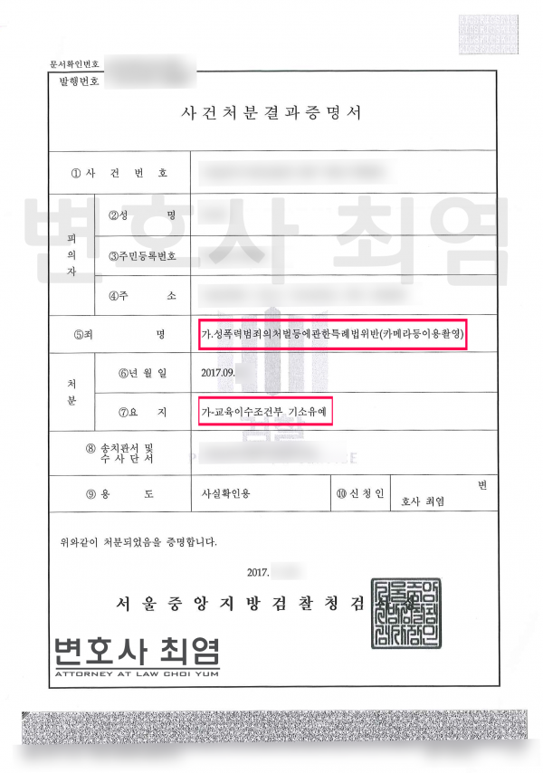 이전 전과가 전혀 없는 점, 호기심에 우발적으로 범행을 저지른 점, 피해자와 원만하게 합의하여 피해자가 처벌을 원하지 않고 있는 점 등의 내용으로 변호인 의견서를 제출하였고, 검찰은 변호인의 변론을 적극 반영하여 성폭력범죄 재범 방지를 위한 교육 프로그램을 이수하기로 하는 조건으로 기소유예 처분을 하였습니다.