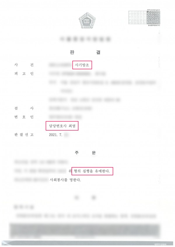 본 변호인은 친구의 권유와 미숙한 판단으로 범행에 가담하게 되었으나 처음부터 범행에 대한 확정적 고의를 가지고 중국으로 건너간것이 아니며, 피해자와 원만하게 합의를 하여 피해자가 선처를 구하고 있고 가족들이 선처호소하며 이러한 범죄에 연루되지 않도록 선도를 다짐하고 있는 점 등으로 적극 선처를 호소하였고 법원은 피고인에게 집행유예를 선고하였습니다.