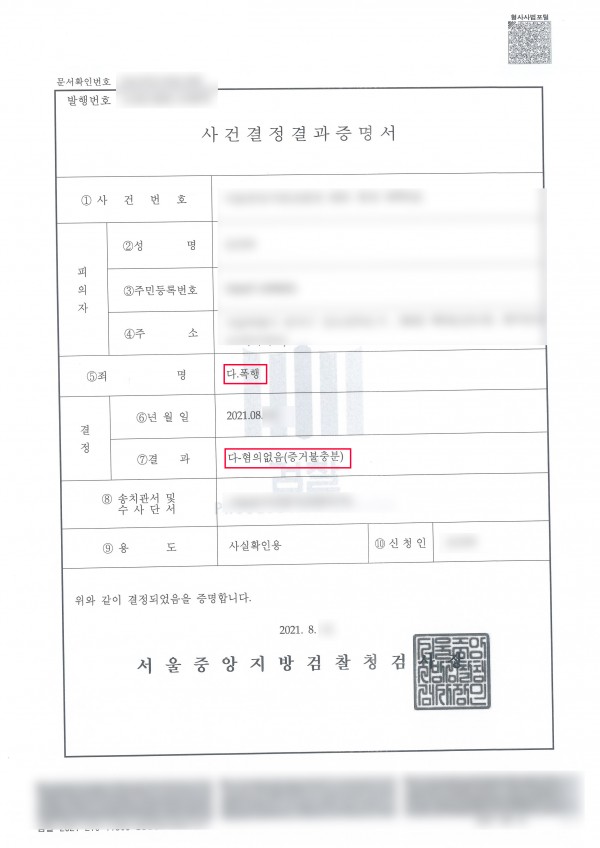 폭행 혐의없음(증거불충분)
