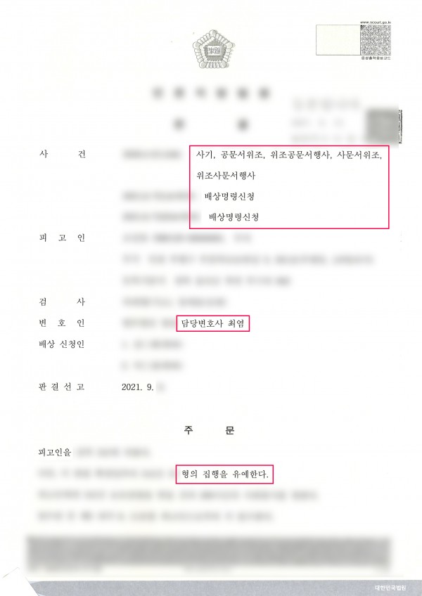 보이스피싱사기,공문서위조,위조공문서행사,사문서위조,위조사문서행사 집행유예(피해금액 약 1억3천)