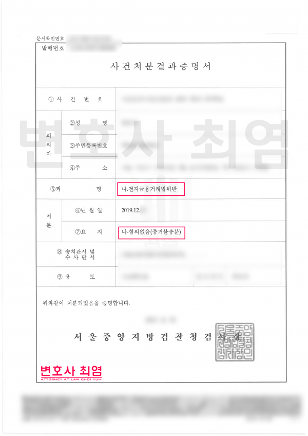 이에 검찰은 의뢰인이 성명불상자에게 접근매체를 택배를 이용하여 제공한 사실은 인정되나 단순 대출의 수단으로 접근매체를 대여한 점, 이로인한 보이스피싱 사기사건의 피해를 입은 점, 실제 대출이라 믿어 이후 접근매체를 돌려받기로 인지하고있었던 점 등 변호인의 의견과 제출된 증거 및 기록들을 종합하여 고려했을 때 접근매체 제공 및 대가를 약속하고 접근매체를 대여하는 것이라 볼수 없어 전자금융거래법 위반 혐의가 없다고 판단하여 위 사건에 대해 혐의없음(증거불충분)처분 결정을 하였습니다.