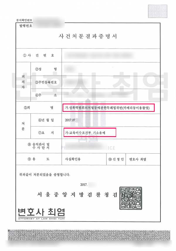 검찰은 이성에 대한 성적 호기심으로 인해 우발적으로 범행을 저지른 사안이며 피해자도 피의자의 처벌을 불원하고 있는 점, 본건 범행을 반성하며 치료를 받는 등 재범의 가능성이 없는 점 등 변호인의 변호 내용을 적극 반영하여 의뢰인에게 교육이수조건부 기소유예 처분을 하였습니다.