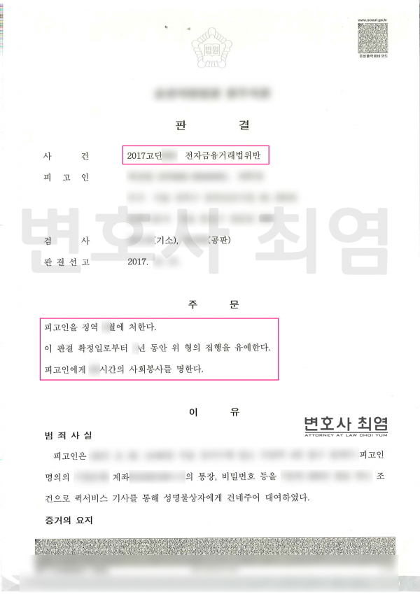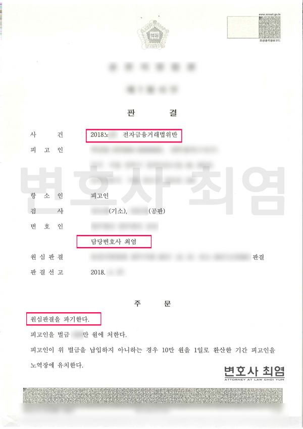 1심에서 집행유예 선고를 받아 항소를 하였고, 원심의 형이 무겁다는 점을 강조하여 의견서를 제출하였습니다. 특히 피고인이 초범이며 계좌에 입금된 금원 등에 대하여 돌려주려고 노력하는 등 여러 가지 양형자료를 제출하였고 이에 재판부는 변호인의 변론에 나타난 여러 양형조건들을 종합하여 원심을 파기하고 벌금형을 선고하였습니다.