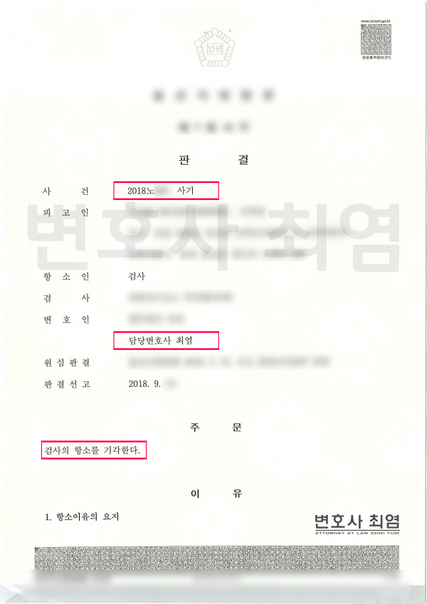 위와 같이 변론한 결과 항소심 재판부에서는 검찰의 항소가 타당하지 않다고 판단하여 의뢰인에 대한 1심의 무죄 판결을 유지하고 검찰의 항소를 기각하였습니다.