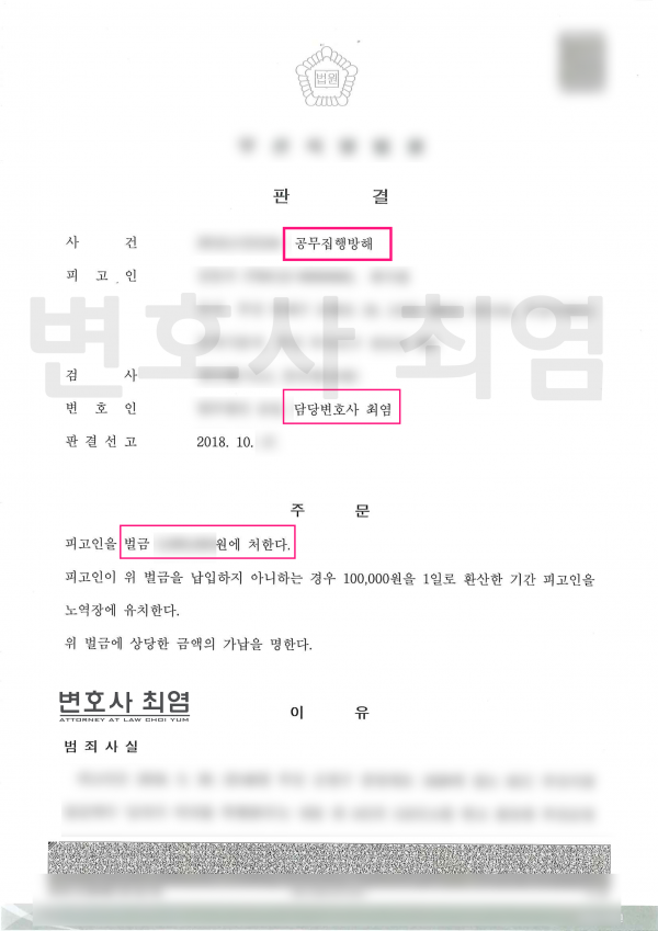 공무집행방해의 경우 구속이 원칙이며 의뢰인의 잘못이 가볍지 않음을 인정하였으나 의뢰인이 반성하며 앞으로 금주를 하겠다는 의지를 보이고 있는 점 및 변호인이 변론 등을 받아들여 의뢰인에게 벌금형 처분을 내렸습니다.[검찰 1년 6월 구형]