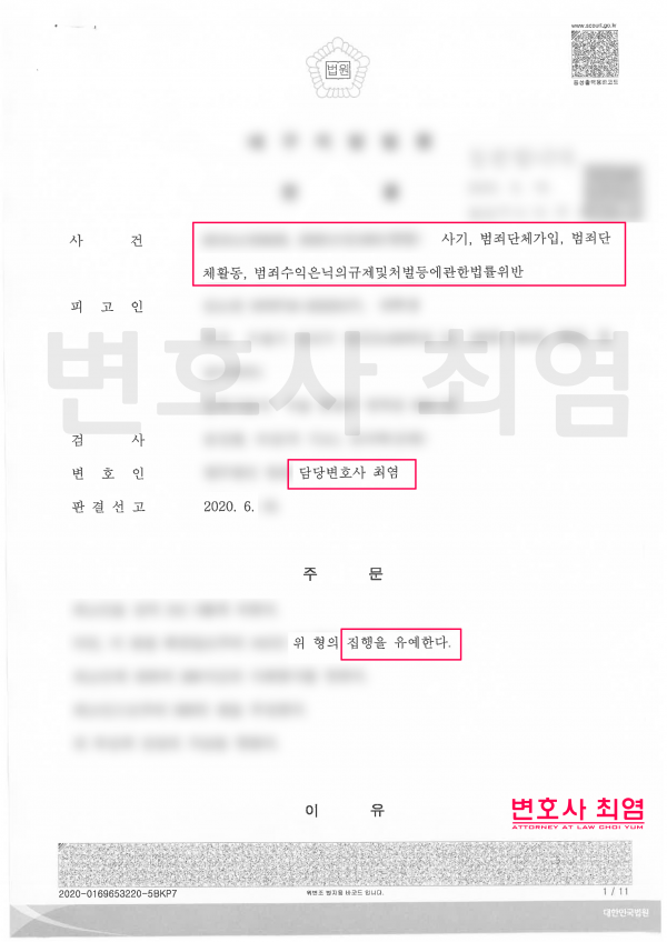 또한 이사건을 통해 의뢰인이 취득한 수익이 많지 않고 친구가 다른나라로 데려가며 도주하게되었으나 스스로 자진하여 입국해 조사를 받은 점, 진행하며 피해자와 원만하게 합의를 하여 피해자가 선처를 구하고 있고 가족들이 선처를 하는 등 이런 범죄에 연루되지 않도록 선도를 다짐하고 있는 점 등으로 적극 선처를 호소하였고 법원은 피고인에게 집행유예를 선고하였습니다.