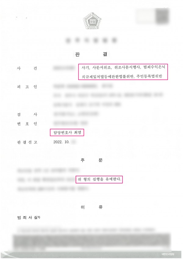 특히 부모님과 친인척, 주변 많은 지인들이 피고인에 대하여 선처를 탄원하고 있으며 다른 형사처벌 전력이 없고 크게 반성하고 있는 점을 적극 변론하였고 이에 법원은 보이스피싱 사기범행은 범행에 가담한 다수인이 각자 분담한 역할을 수행함으로써 전체 범행이 완성되는 특성이 있으므로 범행의 완성에 필수적으로 요구되는 현금수거책으로 가담한 피고인의 책임이 결코 가볍다고 볼 수 없고 다수의 피해자와 편취금액이 7천만원이 넘을 뿐만 아니라 위조된 금융기관 명의 문서까지 이용되어 엄한 처벌이 필요하나