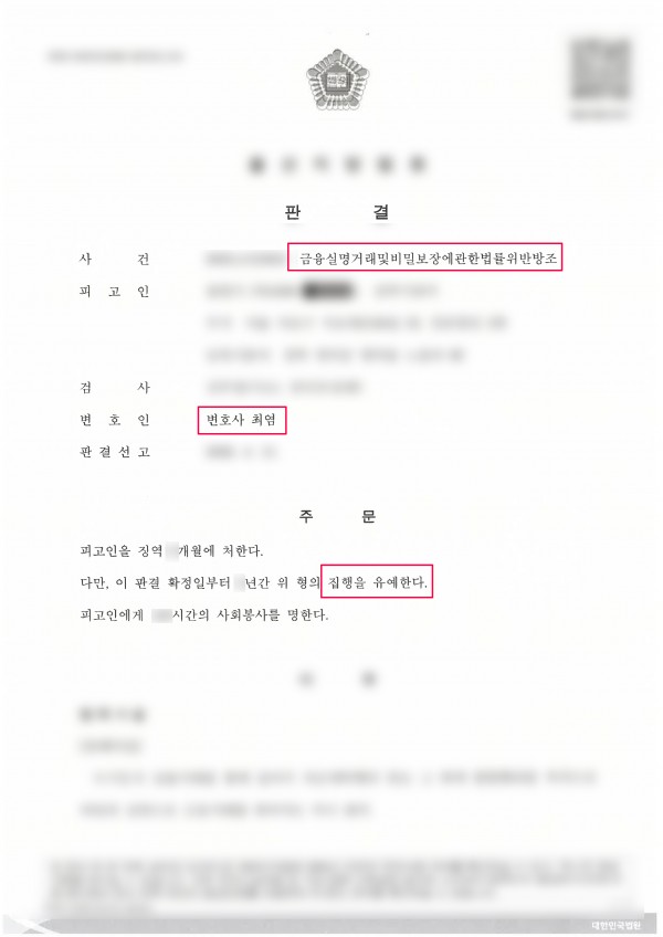 보이스피싱 코인거래알바 금융실명법위반방조 집행유예(동종외 다수전과있음)