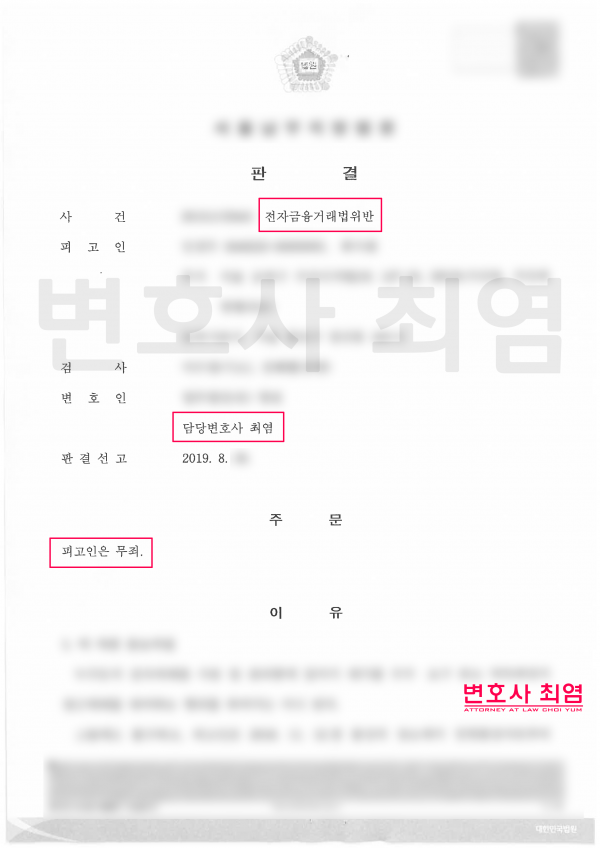 이에 재판부는 변호인이 주장한 내용과 같이 성명불상자에게 알려준것은 공인인증서 비밀번호 등에 불과하며 의뢰인의 관리감독없이 은행계좌를 사용할 수 없었고, 이러한 검사가 제출한 증거들만으로는 공소사실에 기대된 내용과 같이 대가를 약속하면서 접근매체를 대여하였다고 단정하기 어려운점 등 사건 범행에 이르게 된 경위, 범행 이후의 정황 및 이 사건 기록과 변호인의 변론에 나타난 의견을 종합하여 무죄를 선고 하였습니다.