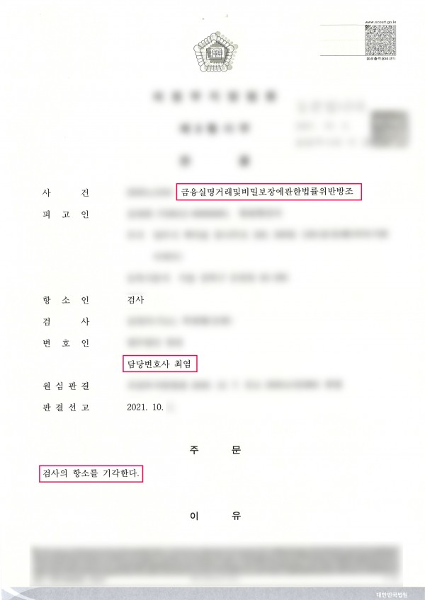 검사가 성명불상자가 타인의 명의로 해외 송금하는 행위가 구체적으로 어떤 강행법규 위반인지 특정한 바 없으므로 탈세라는 명목으로 금융실명거래 및 비밀보장에 관한 법률 제3조 3항이 정한 그 밖에 탈법행위로 볼 수 없고 검사의 주장은 이유가 없다며 검사항소기각하기로 판결하고 피고인의 무죄가 확정되었습니다.
