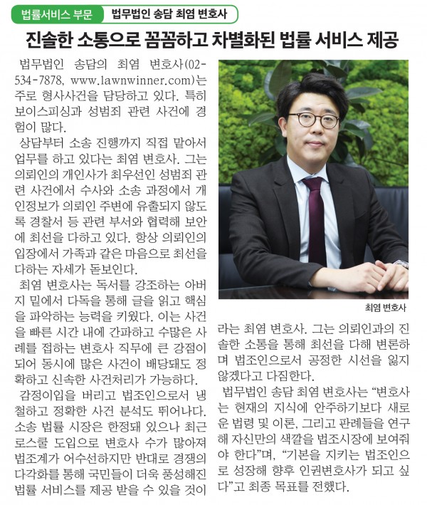 [한국스포츠경제 17.11.09] [2017 고객감동 혁신기업 대상]법무법인 송담 최염 변호사, 진솔한 소통으로 차별화된 법률 서비스 제공