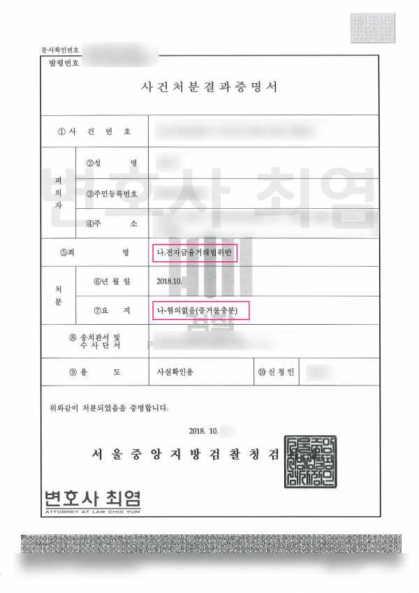 이러한 변호인의 조력의 결과 검찰에서도 의뢰인이 범죄 혐의가 있다거나 이를 알고 자신의 계좌번호를 알려주고 체크카드를 보낸 것으로 보기는 어려워 증거가 불충분하다고 판단하여 불기소처분(혐의없음) 결정을 하였습니다.