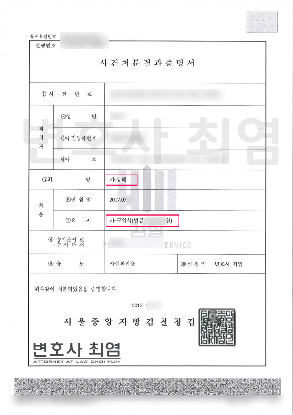 또한 상해 사건이기에 합의가 원만하게 이루어질 수 있도록 하였습니다. 다행히 두 명의 피해자와 원만하게 합의하여 구약식(벌금형)의 처분을 받을 수 있었으며 의뢰인에게 시비를 붙인 피해자 또한 상해로 벌금형의 처분을 받게 되었습니다.