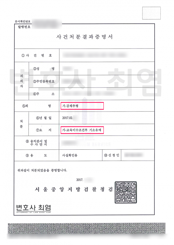 검찰은 이전 처벌을 받은 전력이 특별하게 없는 점, 자신의 잘못을 뉘우치고 반성하고 있으며 우발적으로 범행에 이르게 된 것으로 보이는 점, 피해자가 처벌을 원하지 않는 점 등 변호인이 주장한 사건의 경위 점상참작 사항들을 받아들여 교육이수조건부 기소유예 처분을 하였습니다.