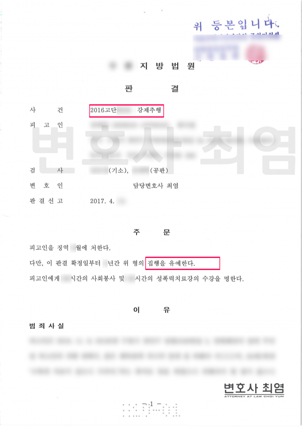 법원은 이전 전과가 상당하고 추행의 정도가 가볍다고 보기 어려우나 의뢰인이 진심으로 반성하고 있고, 피해자가 처벌을 원하고 있지 않는 점, 성폭력과 관련된 전과가 없는 점 등 변호인 의견서에 나타난 모든 양형조건을 참작하여 집행유예를 선고하였습니다.