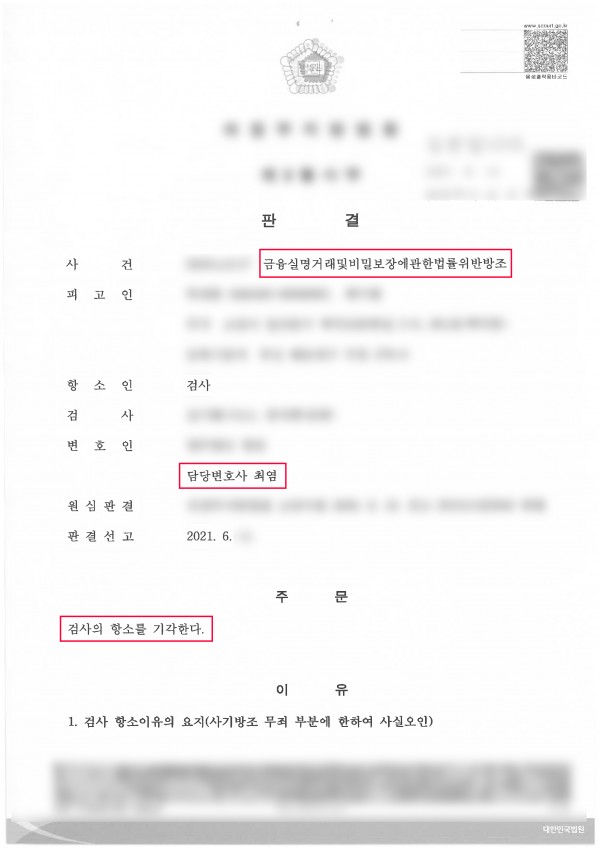 또한 자신의 신분이 노출되어있으므로 형사처벌의 가능성이 높은데도 자신의 명의로 범행을 저지르도록 방조하였다는점에 보이스피싱 범행을 알고 용인하였다고 보기어려우며 유사범죄전력이 없는점, 이 사건으로 인해 취득한 경제적 이익이 없는점 등 보이스피싱 범행을 알고 사기행위를 돕는 것을 용인하였다고 보기어려운점을 들어 의뢰인의 억울함을 간곡히 호소하였습니다. 이에 항소심 재판부는 원심의 판단을 기록에 비추어 검토해보았을 때 원심의 판단은 정당한 것으로 수긍이 가고 검사가 지적하는 사실오인의 위법이 있다고 할 수 없고 검사의 주장은 이유 없으므로 검사의 항소를 기각(무죄)하였습니다.