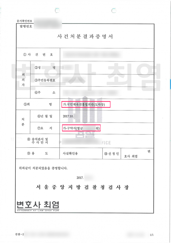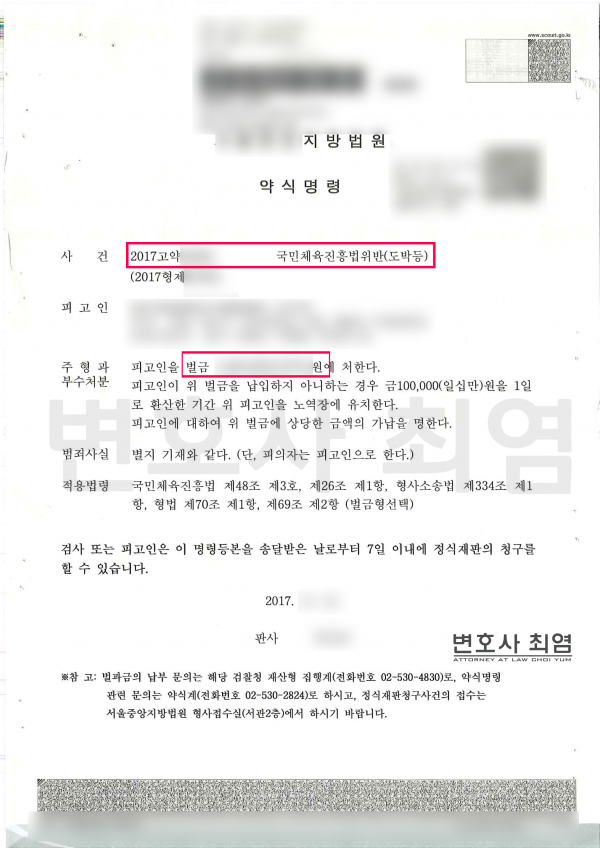 의뢰인의 진지한 반성의 모습과 횟수에 비하여 도금이 많지 않은 점, 전과관계 등 유리한 양형자료들을 변호인 의견서와 함께 제출하였고, 상습도박이 아닌 단순 도박으로 벌금형(구약식)의 처분을 받을 수 있었습니다.