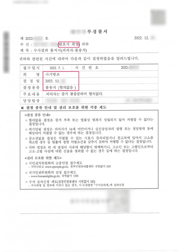 이러한 주장에 수사기관 역시 취득한 이득이 없는 점, 피의자가 자신이 검사의 지시를 받은 조사자라고 밝히며 수거한점을 볼 때 성명불상자가 검사라고 알고 피해자에게 현금을 수거한 점 등 성명불상자에게 이를 전달하였다는 사실만으로는 피의사실을 인정하기 부족한 점 등 기타 변호인의 의견을 반영하여 혐의없음 처분을 하였습니다.