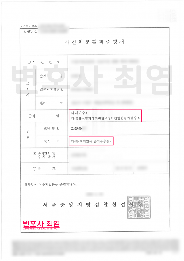 이러한 주장에 검찰 또한 의뢰인에게 불법재산의 은닉, 자금세탁행위 등에 준하는 탈법행위라 보기 어렵고 대출 목적으로 입출금 거래실적을 쌓기 위한 절차라고 자세히 설명하는 카카오톡 대화내역, 피의자가 자신 명의 계좌를 범죄의 수단으로 이용함으로써 범인으로 노출될 위험을 감수하였다고 보기는 어려운점 등 변호인의 의견을 반영하여 혐의없음 처분을 하였습니다.