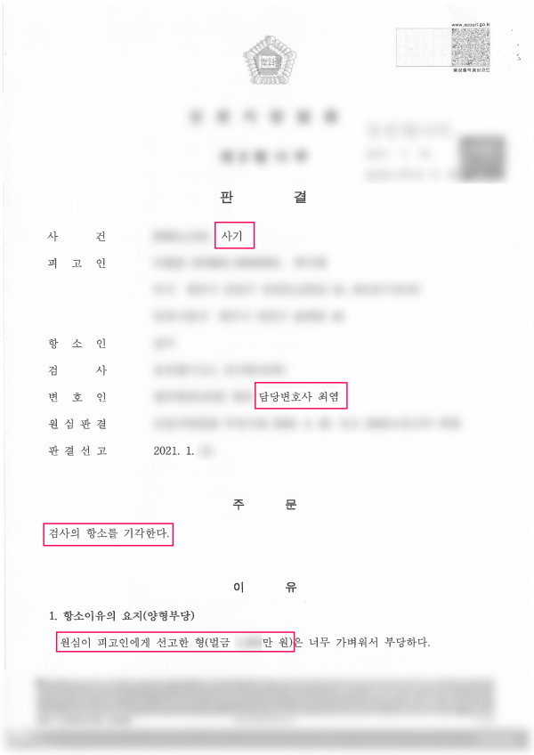 사기 검사항소기각(벌금형) / 보이스피싱인출책 검사항소기각 > 성공사례