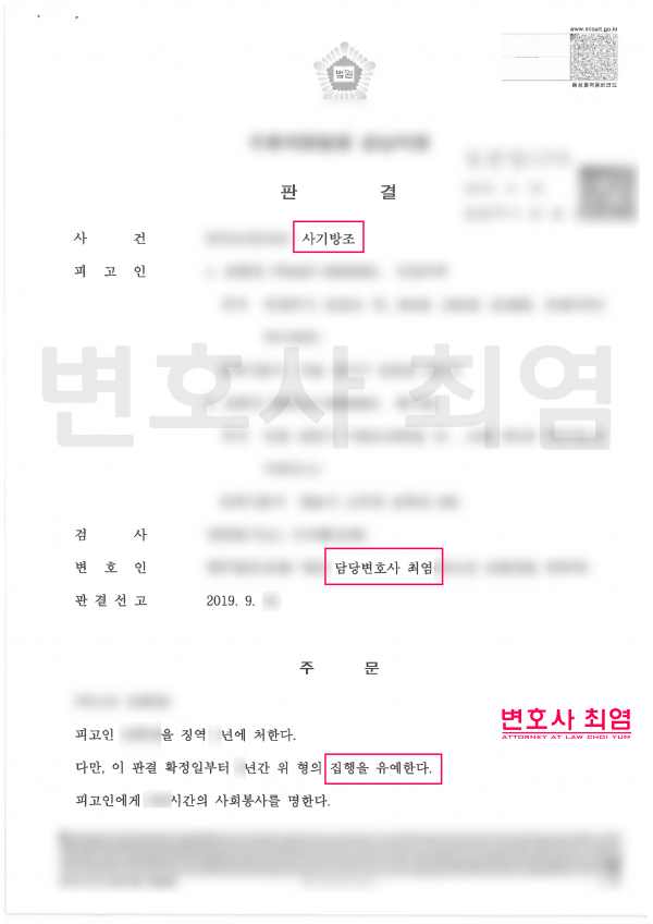 이와 같은 변호인의 조력의 결과, 재판부는 피해금원이 크고 합의가 전혀 이루어지지 않은 등 진심으로 반성하고 있다고 보기 어려우나, 초범이며 가족관계에 참작할 바 있는점, 그 밖의 기타 양형의 조건을 종합하여 집행유예를 선고하였습니다.