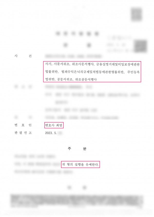 사기,사문서위조,위조사문서행사,금융실명거래및비밀보장에관한법률위반,범죄수익은닉의규제및처벌등에관한법률위반,주민등록법위반,공문서위조…