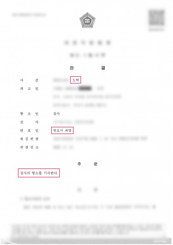 홀더펌에 방문후 도박죄로 본변호인과 정식재판을 청구하여 무죄가 선고되었고 이에 검찰이 항소하여 항소심을 진행하게 됨