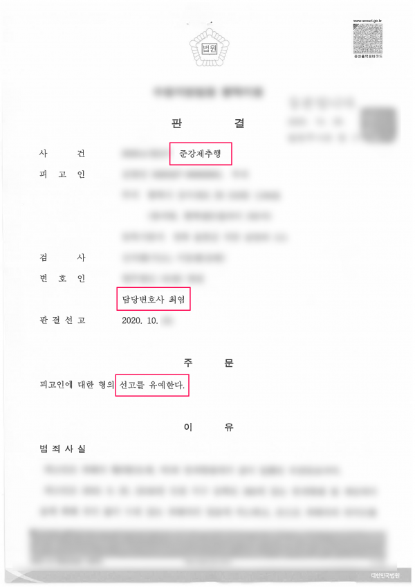 의뢰인은 회식을 한 후 술에 취한 직장동료에게 키스하고 상의를 올려 뽀뽀를 하는 등 강제로 추행하였다는 이유로 재판을 받게 되었습니다.