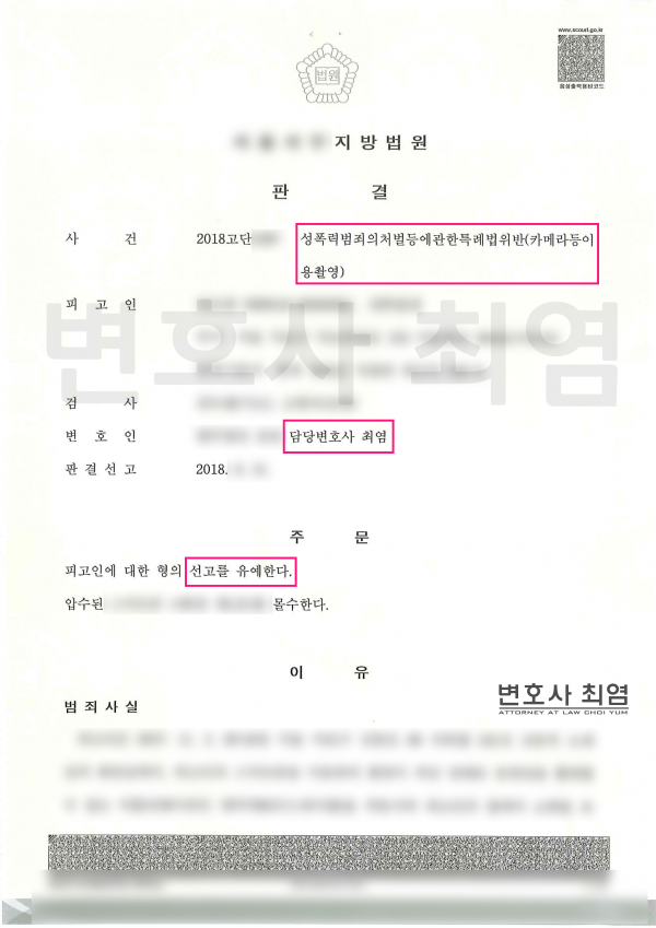 이에 법원은 변호인의 변론내용을 참작하여 의뢰인에게 이례적으로 선고유예를 선고하여 선처하였습니다.