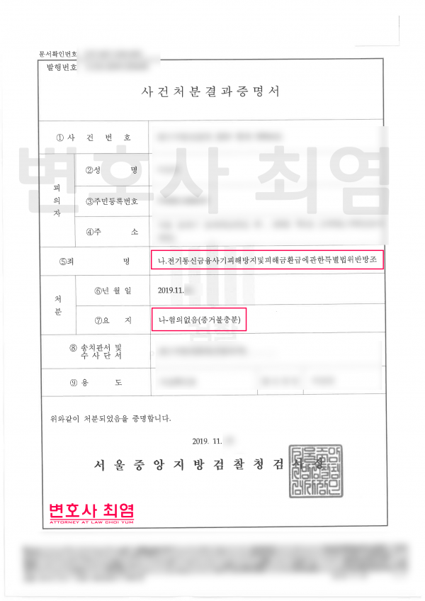 이러한 주장에 검찰 또한 제출한 대화내용에서 진술이 일치하고 범행을 인식할만한 내용이 없으며 이를 방조하였다고 인정할만한 증거가 자료가 없는 등 변호인의 의견을 반영하여 혐의없음 처분을 하였습니다.