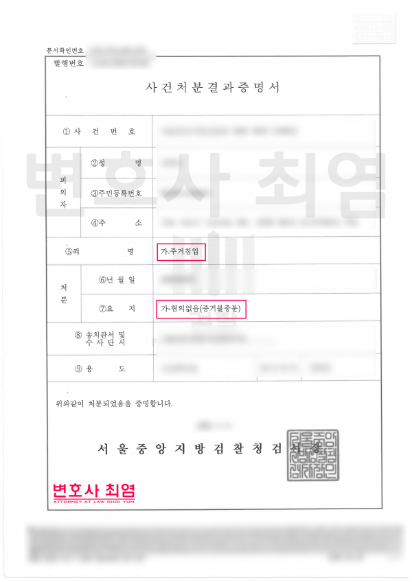 이에 검찰은 해당 빌라 마당에 들어온 부분에 대하여 외부와의 문과 담이 설치되어 있지 않으므로 주거침입의 요지로 보기 어려우며 피해자의 진술만으로는 피의자에게 주거침입의 고의가 있었다고 보기 어렵고 달리 피의사실을 인정할 만한 명확한 증거가 없으므로 변호인의 의견을 적극 반영하여 혐의없음(증거불충분)처분 결정을 하였습니다.