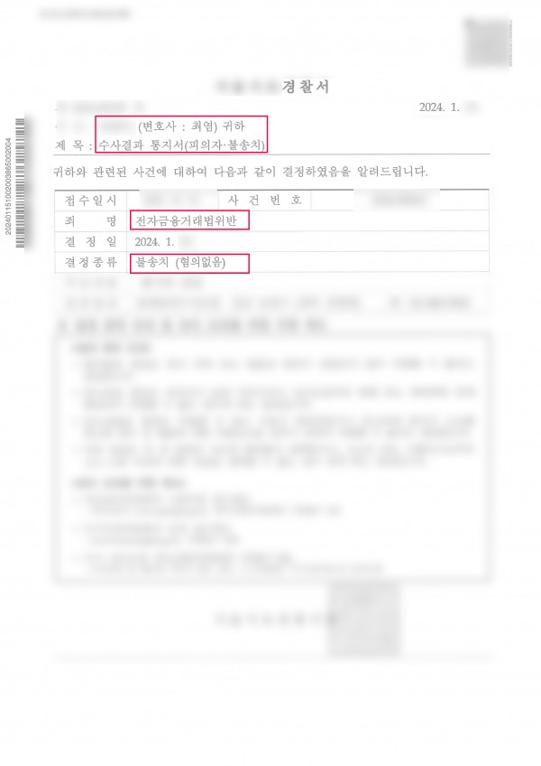 대포통장무혐의/전자금융거래법위반무혐의(불송치)