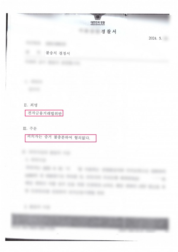 대포통장무혐의/전자금융거래법위반무혐의(불송치)