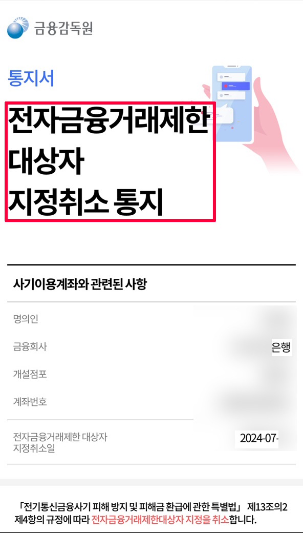 전자금융거래제한대사상자 지정취소 (보이스피싱 지급정지해제 인용)