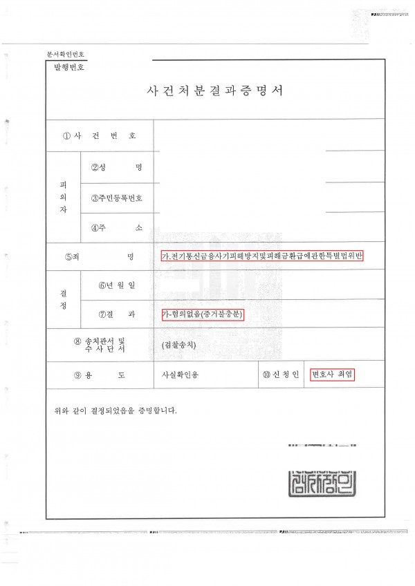 수사기관은 위 입금 금원이 보이스피싱 피해금으로 의심된다는 이유로 의뢰인을 전기통신금융사기피해방지 및 피해금환급에 관한 특별법 위반(일명 보이스피싱 피해금 전달/환전 관여) 혐의로 입건·송치하였습니다.